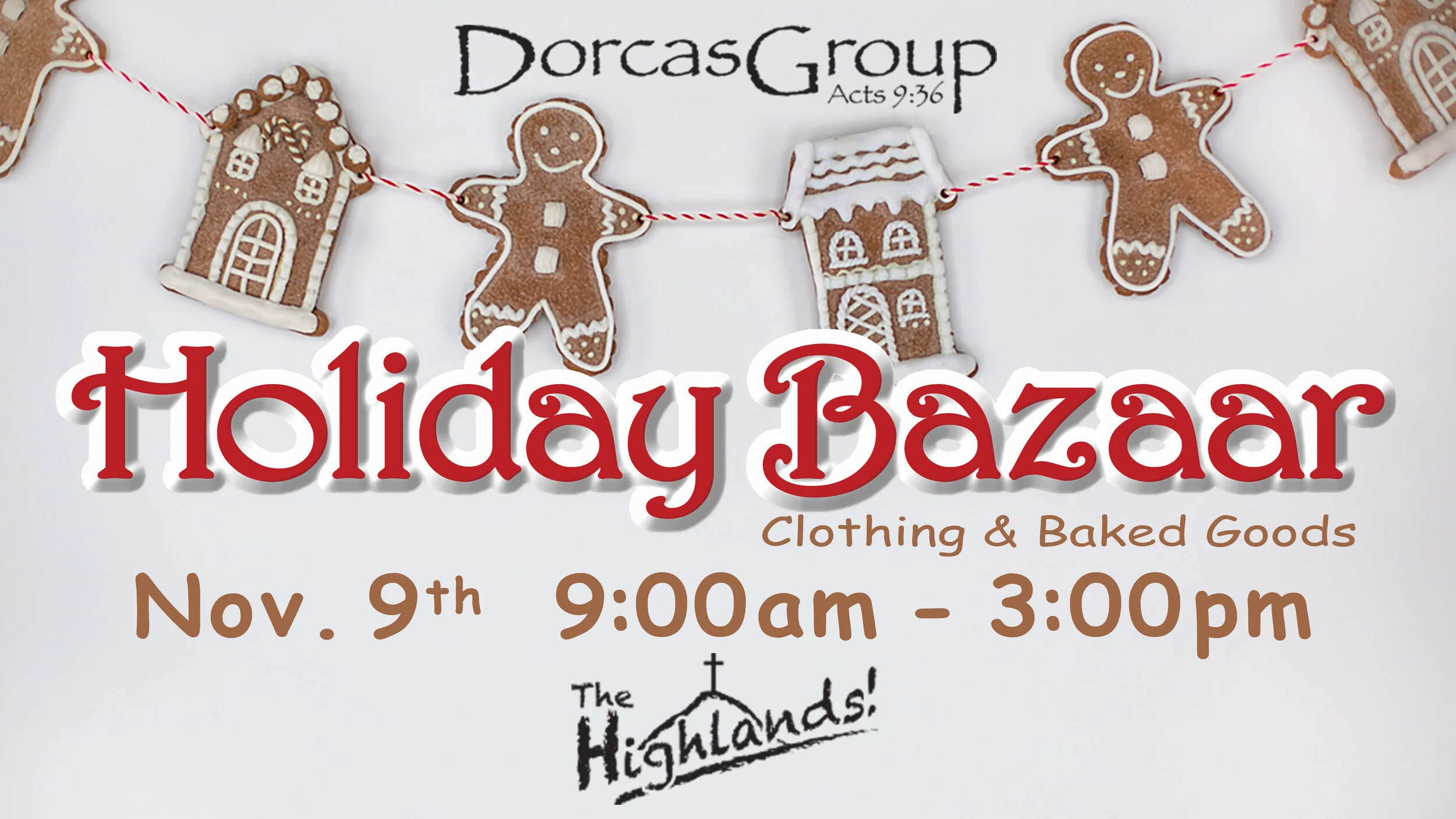 The Highlands' Dorcas Group holds their annual "Holiday Bazaar". Come and see all the hand made clothing and baked goods for sale. Proceeds benefit the Dorcas Group to purchase materials to make clothing for missions.
